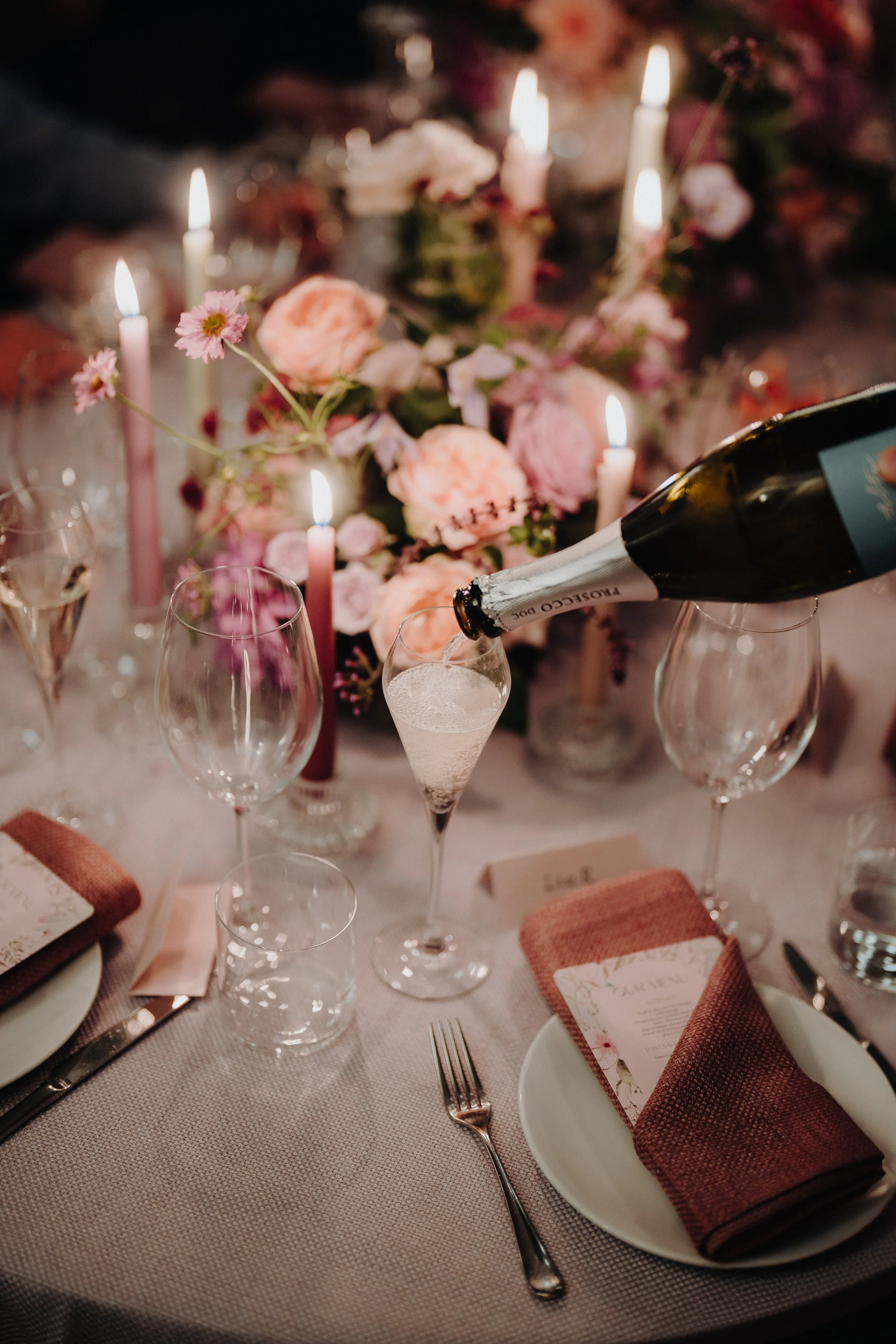 For the reception tables, we created low, abundant arrangements designed to feel as though they belonged there — never staged, always natural. Soft pinks, peaches, lilacs and pops of deeper tones sat alongside flickering candles, linen napkins, and warm wood textures.