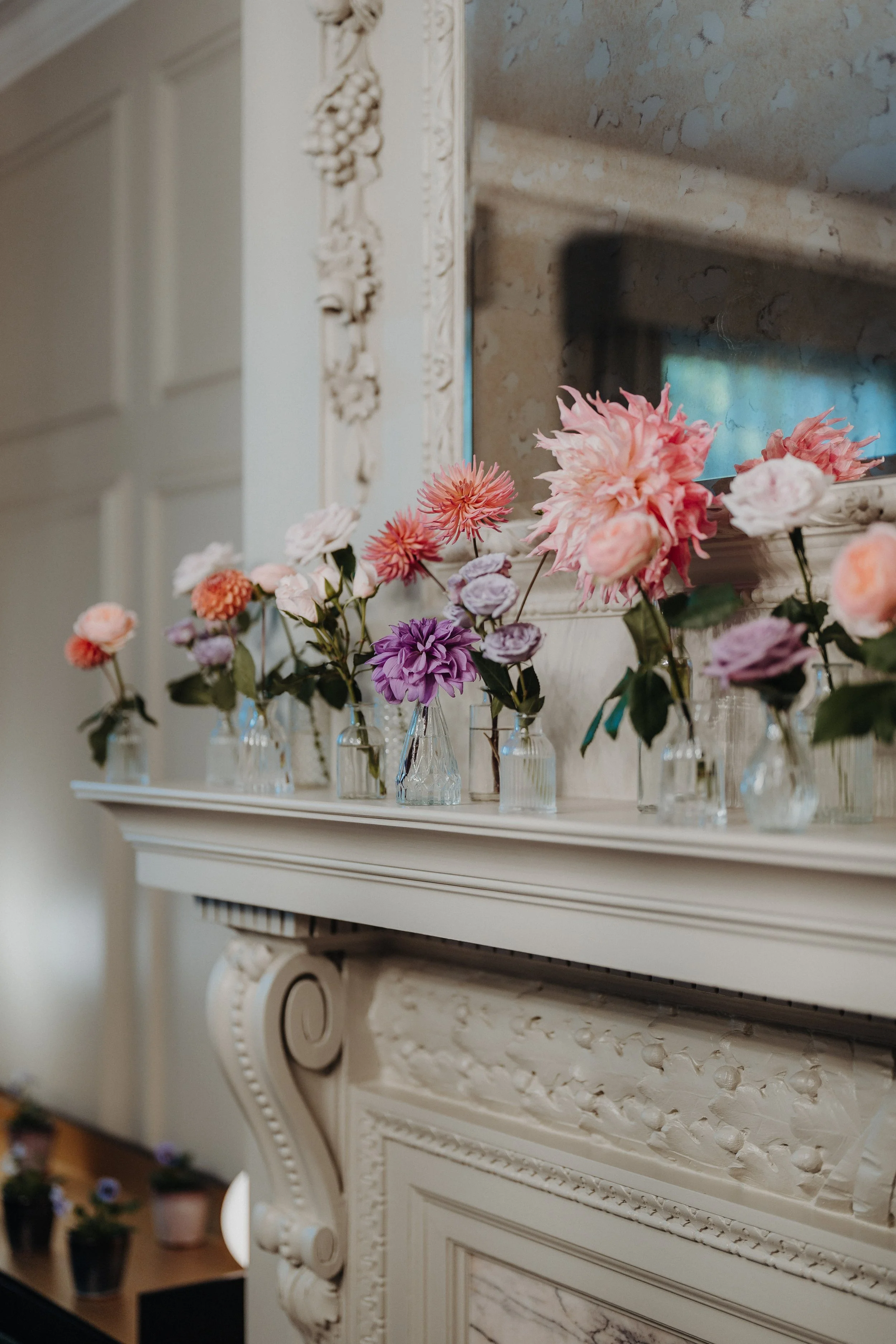 Marylebone Town Hall mantlepiece decorated with budvases filled with Roses and Dahlias